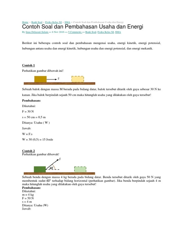 Berikut ini beberapa contoh soal . Bila g = 10 m/s², hitunglah energi potensial benda . Sebuah mobil melakukan kerja(usaha) sebesar 800.000 . Rangkuman materi usaha & energi kelas 10. By jendela ilmu — 8 nov 2016 — 11 comments — bank soal, fisika kelas xi, sma.